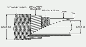 HDP – Heavy duty high pressure, post sintered PTFE lined, antistatic smoothbore conductive, reinforced with high tensile 304 stainless steel braids.